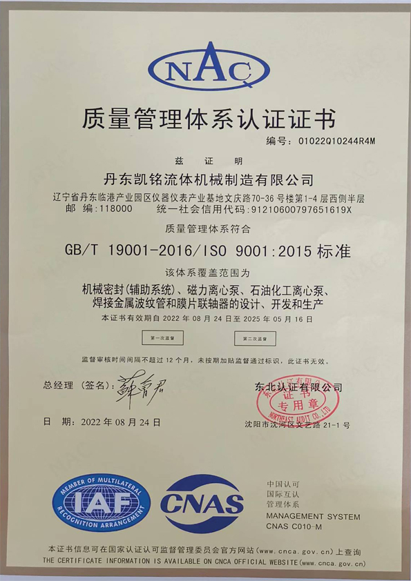丹東凱銘流體機械制造有限公司坐落于風景旖旎的邊境江城---遼寧丹東,是一家集設計、制造、銷售、服務于一體的流體機械專業制造公司,主要產品有:機械密封及輔助系統、膜片聯軸器、焊接金屬波紋管、泵及壓縮機配件。產品廣泛應用于石油煉制、化工、電力、冶金、食品、制藥、印染、煤礦、船舶制造等領域。